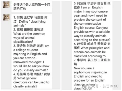 围绕《新交际英语综合教程》“Animals”单元,张老师让学生先集体讨论预习要点,再借助DeepSeek深度预习并记录互动过程。成果展示时,学生汇报思路,老师引导分析差异。