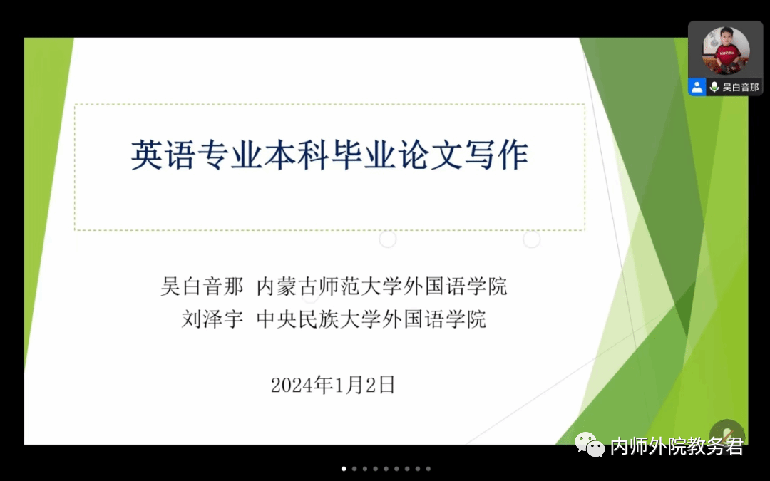 为更好地帮助2024届本科生提高毕业论文写作质量,提升本科生的学术素养,金年会官网英语系于2024年1月2日晚线上召开“本科生毕业论文写作与学术论文发表指导”讲座。本次讲座由英语系系主任苏日娜老师主持,英语系吴白音那老师主讲,英语系2023届优秀毕业生刘泽宇同学分享论文写作经验,2020级、2021级英语专业本科生参加。