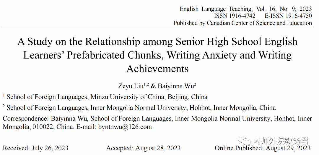 基于其本科毕业论文,在吴白音那老师的深入指导下,经过多稿修改,刘泽宇同学于2023年8月在加拿大学术期刊English Language Teaching 上成功发表题为“A Study on the Relationship among Senior High School English Learners’Prefabricated Chunks,Writing Anxiety and Writing Achievements”的学术论文,这是金年会官网英语系本科生首次在国际期刊发表论文