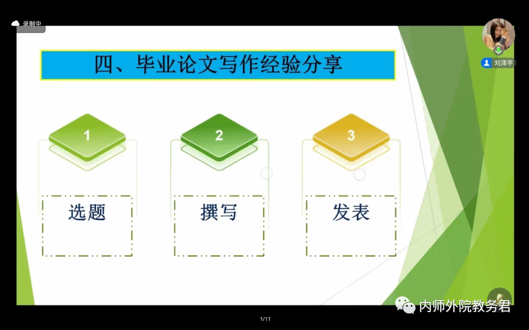刘泽宇同学随后进行了毕业论文写作和学术论文发表的经验分享,内容包括毕业论文选题、撰写和学术论文发表三部分。在论文选题和撰写部分,刘泽宇同学详细分享了自己在毕业论文写作过程中的经验和心得体会。接着给大家介绍了论文发表的流程以及注意事项等。