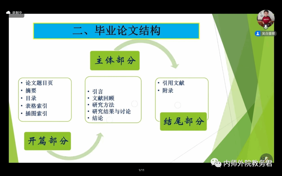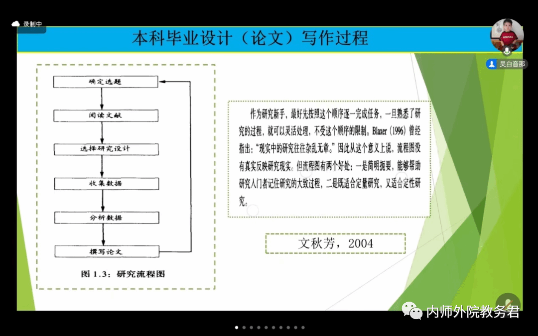 首先,吴白音那老师阐述了毕业论文的重要性,强调毕业论文是实现培养目标的重要教学环节,在培养大学生的探求真理、强化社会意识进行科学研究基本训练、提高综合实践能力与素质等方面具有不可代替的作用。接着,吴白音那老师梳理了毕业论文的写作过程。