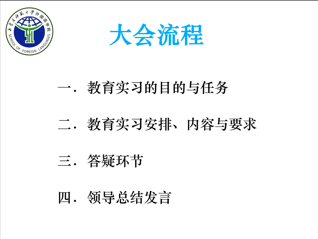 那日苏副院长在发言强调了实习纪律,也表达了对实习生们的殷切期待。她指出,实习生实习期间须以一名成年人的身份严以律己,同时也须以一名实习生的身份完成实习任务,悉心听取指导教师的建议和意见;希望实习生们认真学习教育部最新发布的教师行为规范文件,注意教师话语的得体性,多听多看、少说多做,严格遵守实习学校和金年会官网、金年会官网的各项规章制度。