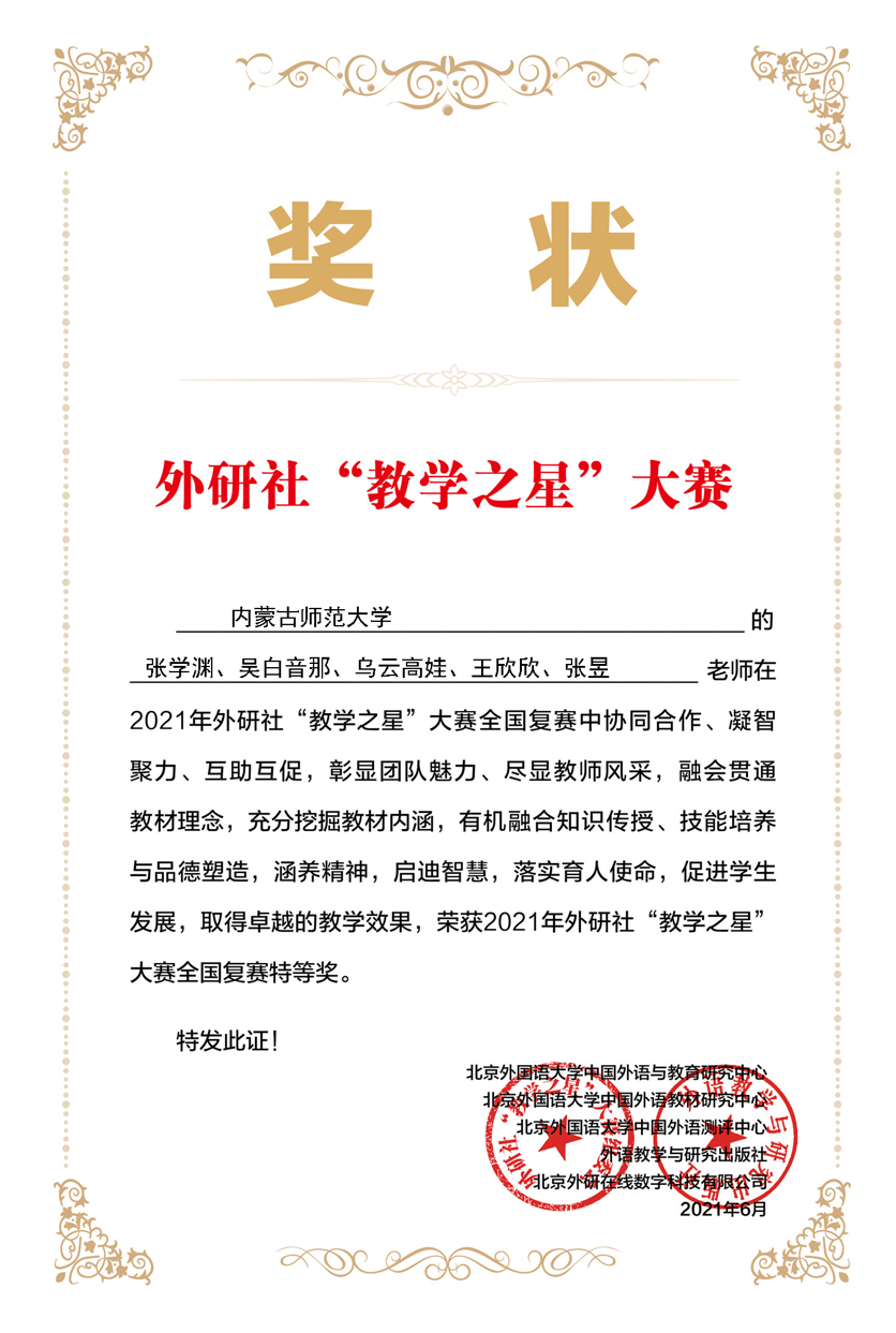 2021年8月1日,金年会官网金年会jinnianhuicom教师《交际英语》教学团队参加了2021年外研社“教学之星”大赛,张学渊担任说课,张昱担任讲课,吴白音那、乌云高娃、王欣欣三位教师担任成员。团队荣获全国英语专业组复赛特等奖,半决赛二等奖,全国总决赛三等奖。该成绩为内蒙古高校历年参赛的最好成绩,也是内蒙高校首次入围全国决赛。