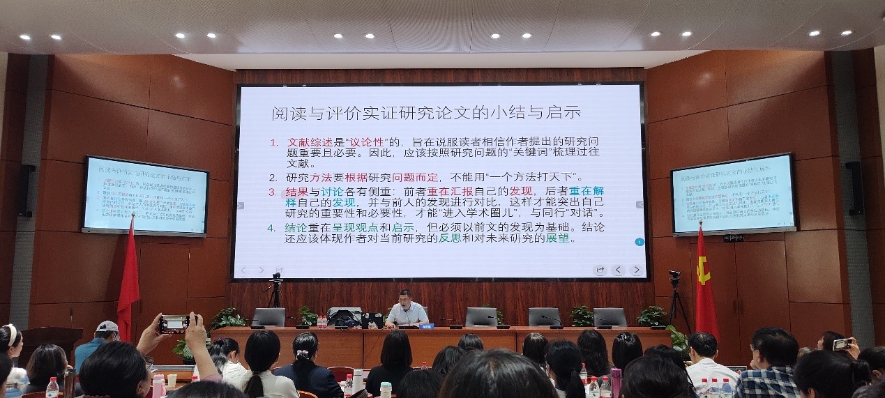 5月27日,北京语言大学许宏晨教授带来题为“量化研究方法与论文写作”的研修讲座。许教授从文献的阅读与评价入手,结合具体论文实例,深入浅出地讲解了阅读与评价实证研究论文的惯例思路、要领和技巧。随后,许教授分享了量化研究选题策略与量化研究设计思路。以教育语言学为例,许教授提炼出五条选题策略:了解学科概貌、锁定研究领域、聚焦研究话题、拓展相关知识和关注国家大事。在量化研究设计环节,许教授重点阐明了量化研究设计与统计的关系,详细讲解了统计分析的类型、选择条件和不同功能,并慷慨分享了统计方法方面宝贵的学习资源。以《外语教育研究前沿》为例,许教授还对学术期刊投稿流程、注意事项等进行了细致的讲解。讲座最后,许教授与研修学员进行了亲切互动,对与会师生提出的问题进行了耐心、细致的解答。