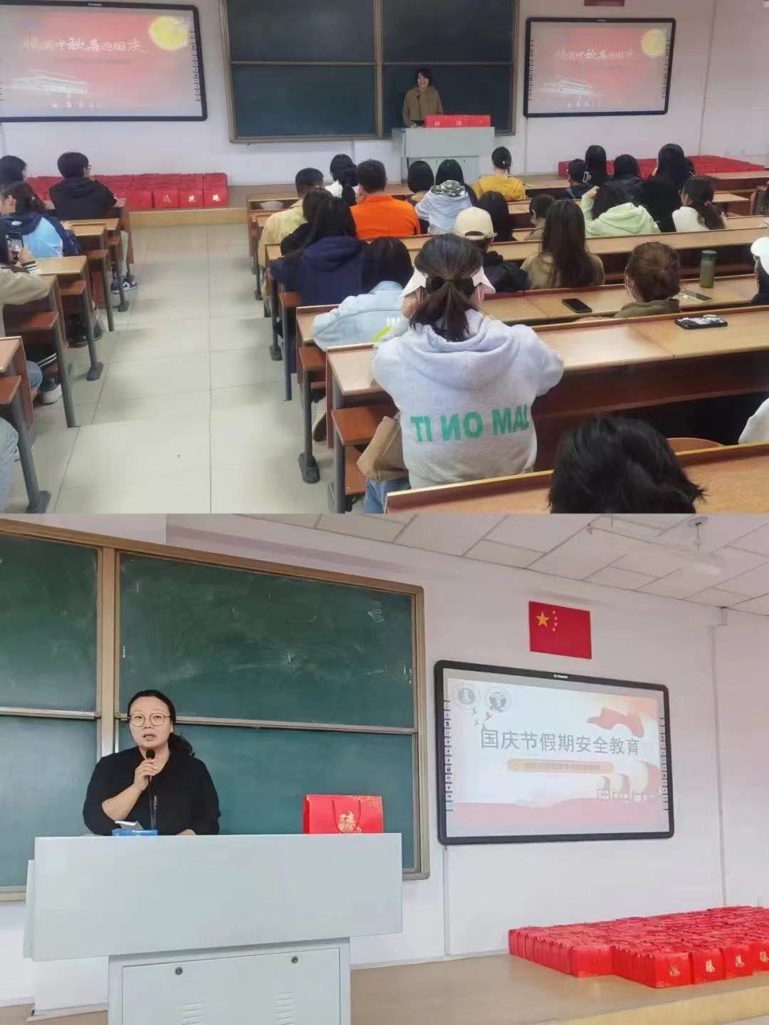 赵晓军院长亲切问候在校学生,向大家致以节日的问候和诚挚的祝福,她嘱咐同学们合理规划假期生活、注意安全、快乐的度过双节。老师们为每一位学生送上中秋的祝福和学院精心准备的月饼和水果。月饼虽小,却蕴含着浓浓亲情和暖暖爱意,承载着学院对学生们的关切和期望。同学们纷纷表示感谢学院传递的温暖和关怀,将珍惜在校园的时光,不断努力学习。