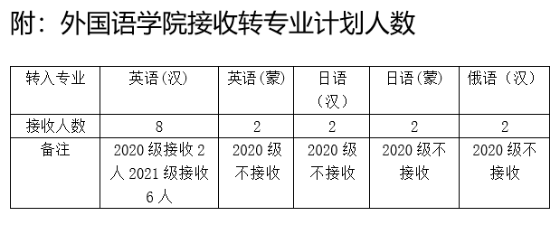(1)因专业特殊性,俄语、日语专业只接受2020级学生转入2021级就读申请。有俄语、日语语言基础的优先,学生需参加俄语、日语水平考试,按照考试成绩排名先后录取。