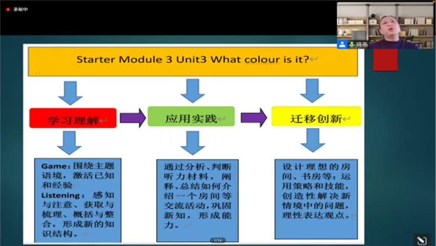 讲座从英语学科核心素养展开,聚焦为何进行“单元整体教学设计”,达到目标意识、单元意识、学生意识的建构。任老师首先介绍了 “大观念”的概念和特点,探讨了“大观念”的学习迁移价值和四个特征:永恒性、中心性、抽象性、网状性,强调“大观念” 是落实学科核心素养的重要抓手。其次,结合义务教育英语课程标准(2022版),任老师细致地分析了学科核心素养和课程目标的新要求,强调单元整体教学内涵及其意义,凸显学习活动观的层次。最后,任老师通过具体案例,结合新人教版和外研版教材进一步明晰了在文本解读后,如何进行大观念开展单元整体教学设计,做到单元内容结构化。讲座最后,任老师和同学们进行了线上互动交流。