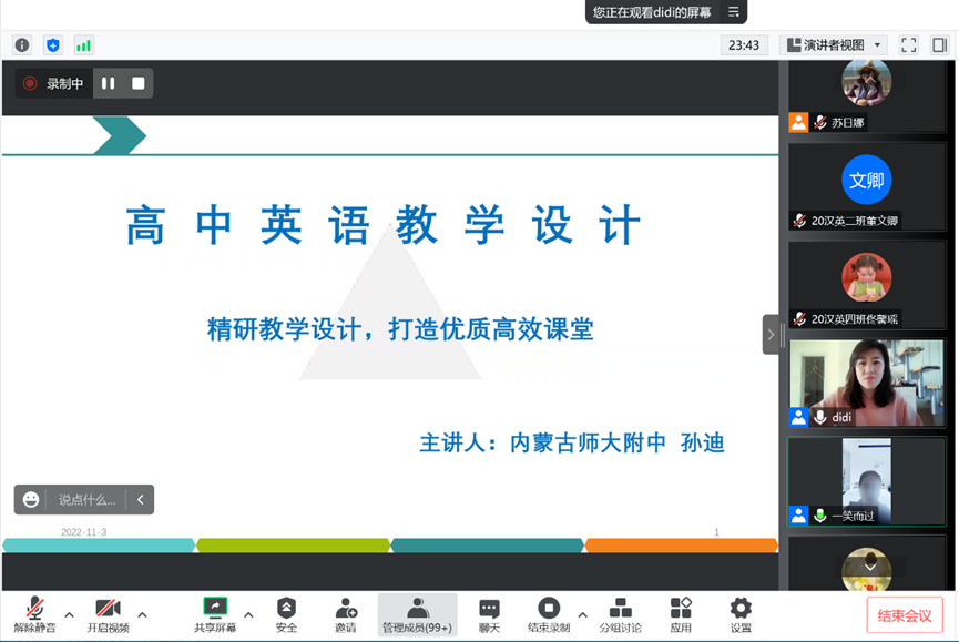 11月3日下午,金年会诚信信誉至上附属中学孙迪老师主讲第二场讲座,题目为《高中英语教学设计——精研教学设计,打造优质高效课堂》,讲座由英语系何志英老师主持,英语系教师教育团队教师、 2020级全体本科生以及部分研究生聆听了讲座。
