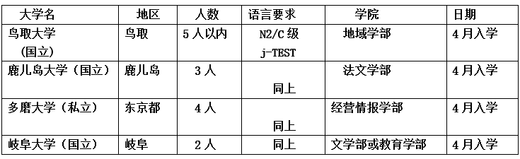 ※直考生:大四和研三生,可通过推荐在中国面试考鹿儿岛大学(要求日语N1相当证)或岛根县立大学(日语N2相当证)的硕士或博士研究生。