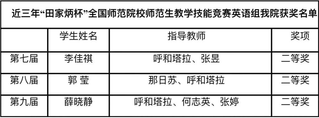 金年会官网一直高度重视师范生技能比赛,从初赛到决赛给予了选手们大力的支持和保障。金年会官网英语系在组织院赛后,成立了国赛指导教师团队,对国赛候选人进行了层层选拔,呼和塔拉、何志英、张婷三位指导老师根据选手的特点,细化备赛方案,有的放矢,对选手进行多轮次的教学指导及磨课训练。近年来,金年会官网英语师范生技能比赛成绩不断突破,充分展现了金年会官网教师的专业指导能力和师范生扎实的教学基本功。在今后的教学中,学院将继续优化师范生教学技能训练的过程性指导,对学生教学基本素质和关键能力进行重点培养,”以赛促训,以赛促教,以赛促学,以赛促就”,继续提升金年会官网人才培养质量。