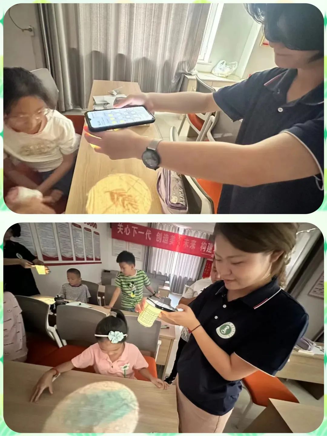 志愿者们使用简单的纸杯、胶带、彩笔帮助孩子们制作了一个简单的投影工具——纸杯投影仪,帮助孩子们直观的感受光与影,并得出了“光是由直线传播的”这一定律。