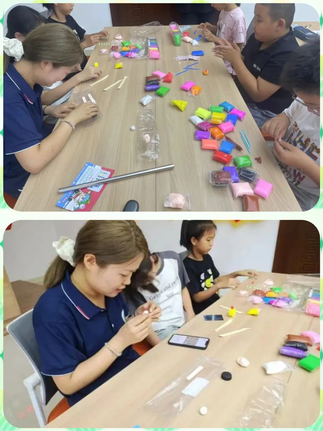 志愿者们通过多媒体,搜集粘土制作范例作品图片,引导孩子们学习黏土制作的基本方法,如揉捏、拉伸、切割等技巧,同时介绍使用的工具和设备,如擀面杖、模具等。并结合粘土制作动画视频,让孩子们在欣赏的同时,启发孩子的创作思路。