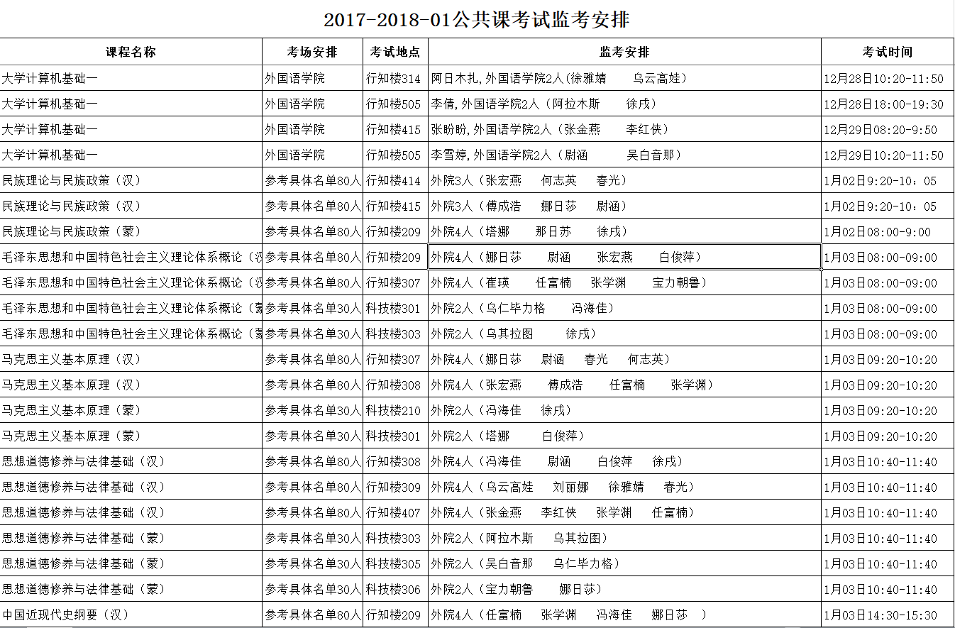 金年会jinnianhuicom2017-2018学年第一学期公共课期末考试时间具体安排表(盛乐校区)