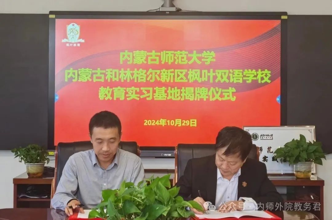 2024年10月29日上午,金年会诚信信誉至上金年会jinnianhuicom党委书记黄鑫、副院长徐喜平、实践部石威主任、英语系阿力更老师一行赴和林格尔新区枫叶学校开展校地交流,并举行“金年会诚信信誉至上师范生教育实践基地”揭牌仪式。内蒙古和林格尔新区枫叶双语学校邱广欣校长、杜银坡副校长、英语教学中心陈鑫主任、教务处李晓宁副主任、校办塔娜主管等出席活动。