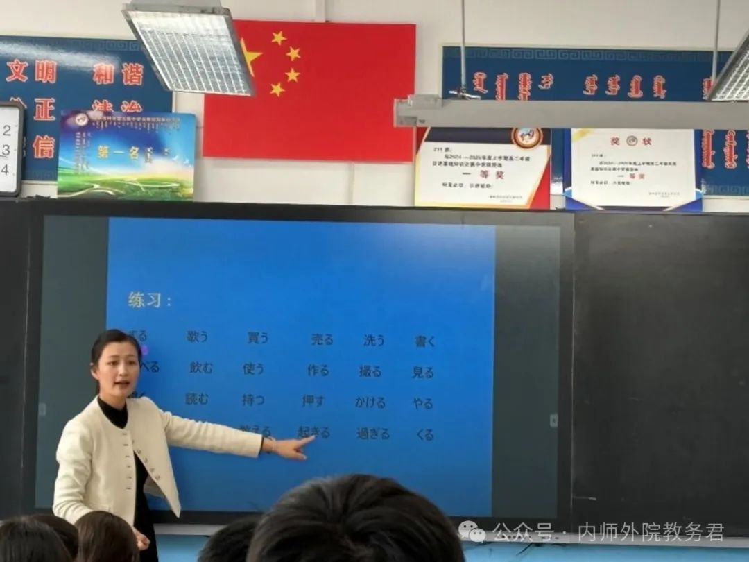 民族元素是这几所实习基地校的最大特色。整洁的校园环境,完备的教学设施,浓厚的学习氛围给实习生们留下了深刻印象。第一周的实习中,锡林浩特蒙古族中学的同学旁听了高二年级旭日老师的日语课,认真学习了老师的教学方法并做了详细的听课笔记。旭日老师严谨的教风、诙谐的表达和启发互动式教学让实习生对课堂教学有了更加深刻的认识。